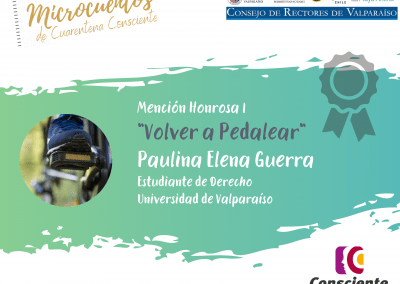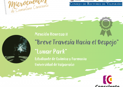 La ganadora del concurso, Bárbara Carroza señaló que “haber participado en este concurso fue algo súper gratificante ya que me permitió reconectarme con mi creatividad, fue desafiante y divertido a la vez contar una pequeña historia y que ésta fuese significativa. Mi inspiración fueron las personas en situación de calle, las cuales muchas veces abusan del alcohol. Vivo en la parte alta de Viña del Mar, por tanto ver ese escenario para mí es cotidiano, quise contarlo y mostrar mi lado de la cuarentena”.
