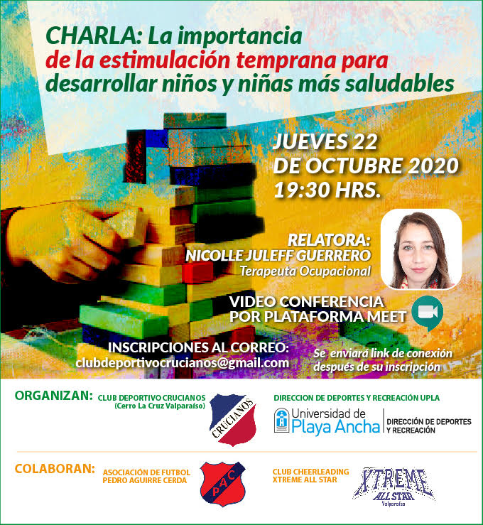 En esta oportunidad se desarrollará la charla «La importancia de la estimulación temprana para desarrollar niños y niñas más saludables», la que se realizará el día jueves 22 de octubre a las 19.30 horas. La relatora será Nicolle Juleff Guerrero, terapeuta ocupacional.