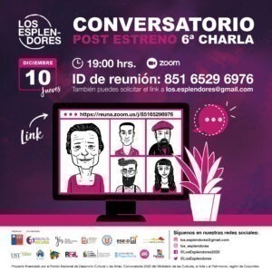 El estreno de la charla será hoy jueves 10 de diciembre, a las 17.15 horas, a través del canal de YouTube «Los Esplendores», y luego se efectuará con un conversatorio post estreno con la charlista vía plataforma Zoom, a las 19.00 horas. Para acceder a esta última actividad, se debe ingresar unos minutos antes al siguiente enlace, o empleando el ID de reunión 851 6529 6976.