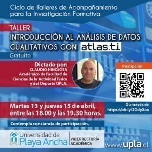 La Vicerrectoría Académica, en conjunto con la Unidad de Análisis y Estudios de la Progresión Académica (ANEPA), informa que se abrieron las inscripciones para el taller «Introducción al Análisis de Datos Cualitativos con ATLAS.ti», el cual será dictado por el académico Claudio Hinojosa, de la Facultad de Ciencias de la Actividad Física y del Deporte (UPLA).