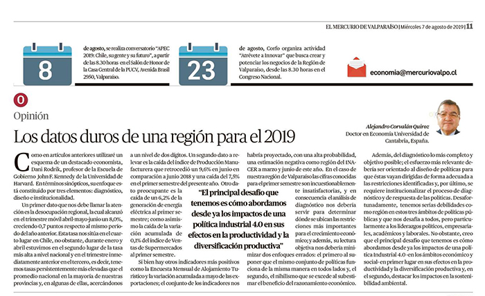 Columna de opinión del académico de la Facultad de Ingeniería, Dr. Alejandro Corvalán Quiroz, publicada por El Mercurio de Valparaíso, página 11, miércoles 7 de agosto de 2019.