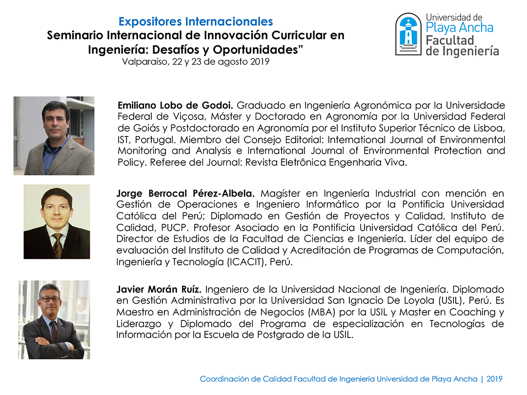 En este último caso, han sido invitados Javier Morán Ruiz, director de las carreras de Ingeniería Industrial e Ingeniería Logística de la Universidad San Ignacio de Loyola (USIL) y presidente del Comité de Acreditación de la Facultad de Ingeniería de la USIL de Perú; y Jorge Berrocal Pérez-Albela, director de Estudios de la Facultad de Ciencias e Ingeniería de la Pontificia Universidad Católica del Perú y líder del equipo de evaluación del Instituto de Calidad y Acreditación de programas de Computación, Ingeniería y Tecnología (ICACIT).