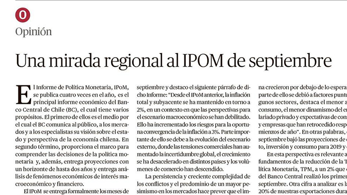 El IPoM se entrega formalmente los meses de marzo, junio, septiembre y diciembre y, sin duda, es uno de los informes más sólidos y comple­tos de la economía chilena. Hace unos días atrás, se entregó el IPoM correspondiente al mes de septiembre y destaco el siguiente párrafo de dicho Informe: “Desde el IPoM anterior, la inflación total y subyacente se ha mantenido en torno a 2%, en un contexto en que las perspectivas para el escenario macroeconómico se han debilitado. Ello ha incrementado los riesgos para la oportu­na convergencia de la inflación a 3%. Parte importante de ello se debe a la evolución del escenario externo, donde las tensiones comerciales han aumentado la incertidumbre global, el crecimiento se ha desacelerado en distintos países y los volúmenes de comercio han descendido.