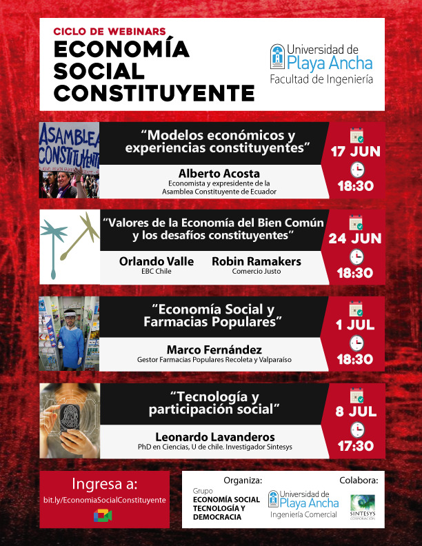 Las charlas virtuales comienzan este jueves 17 de junio, a las 18:30 horas, con la exposición sobre “Modelos económicos y experiencias constituyentes”. Las siguientes semanas y en el mismo horario, salvo el 8 de julio que será a las 17:30 horas, distintos expositores se referirán al movimiento de la Economía del Bien Común (EBC) en Chile, a la Economía Social y las farmacias populares y a la tecnología y la participación social.