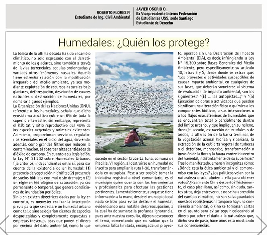Lamentablemente, aunque se tiene información a la mano, desde el municipio local nada se hizo para evitar destruir el humedal, evidenciando una notable despreocupación, a la cual ha de sumarse la profunda ignorancia, pues ante nuestra consulta, dijeron desconocer el tema, comentando que no sabían que la empresa Tafca Limitada, encargada del proyecto, operaba sin una Declaración de Impacto Ambiental (DIA), es decir, infringiendo la Ley Nº 19.300 sobre Bases Generales del Medio Ambiente, pero específicamente su artículo 10, letras E y S, desde donde se extrae que: “Los proyectos o actividades susceptibles de causar impacto ambiental, en cualquiera de sus fases, que deberán someterse al sistema de evaluación de impacto ambiental, son los siguientes: «(E)…las autopistas..;” y «(S) Ejecución de obras o actividades que pueden significar una alteración física o química a los componentes bióticos, a sus interacciones o a los flujos ecosistémicos de humedales que se encuentran total o parcialmente dentro del límite urbano, y que impliquen su relleno, drenaje, secado, extracción de caudales o de áridos, la alteración de la barra terminal, de la vegetación azonal hídrica y ripariana, la extracción de la cubierta vegetal de turberas o el deterioro, menoscabo, transformación o invasión de la flora y la fauna contenida dentro del humedal, indistintamente de su superficie».