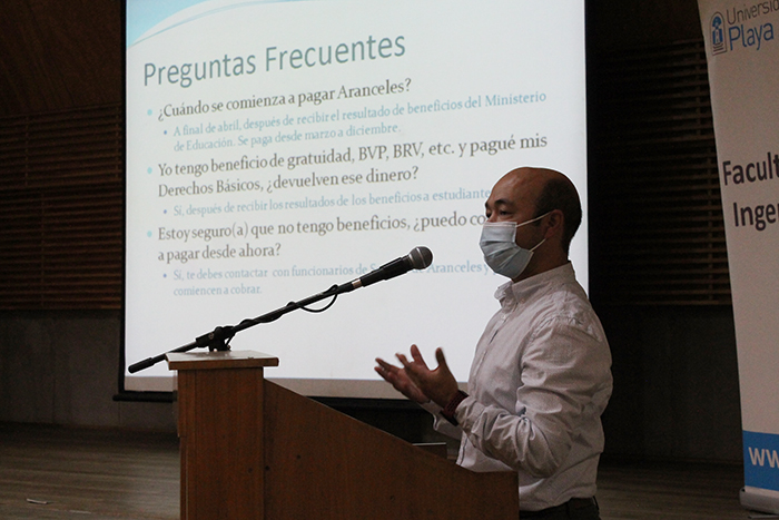 Desde el Departamento de Aranceles estuvo presente Richard Castillo Molina, jefe de la unidad; y Miguel Ahumada Montenegro, ejecutivo encargado del Crédito con Aval del Estado (CAE). El primero de ellos, dio cuenta de cómo acceder a la situación arancelaria de cada estudiante, a través del Sistema Integrado, y efectuar sus pagos en línea. También respondió varias consultas, por ejemplo, de quienes cuentan con beneficios de gratuidad y becas, y si existe devolución de los derechos básicos, a lo que contestó que sí.