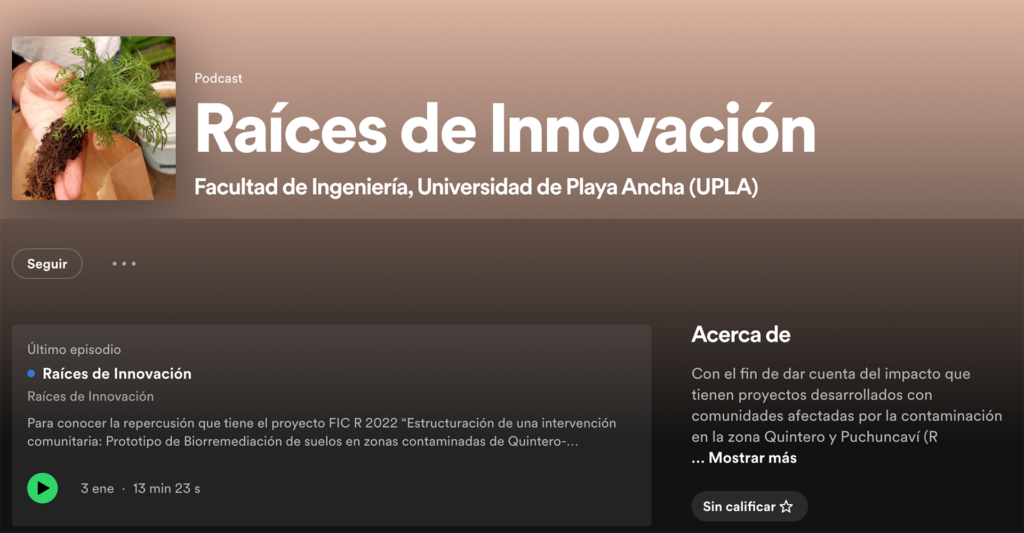Con el fin de dar cuenta del impacto que tienen proyectos desarrollados con comunidades afectadas por la contaminación en la zona Quintero y Puchuncaví, nace Raíces de Innovación. El primer podcast de la Facultad de Ingeniería que cuenta con el apoyo de la Dirección General de Comunicaciones y del Centro de Experimentación Radial de la Facultad de Ciencias Sociales de la Universidad de Playa Ancha, a través del registro y edición del ingeniero en sonido Felipe Cabrera, y que se podrá escuchar a partir de enero en Spotify.