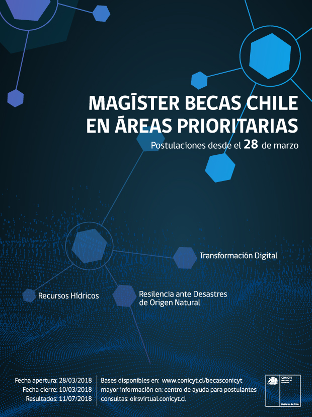 El miércoles 28 de marzo, la Comisión Nacional de Investigación Científica y Tecnológica (Conicyt), a través de su Programa Formación de Capital Humano Avanzado, abrió la convocatoria 2018 de su beca de Magíster en el Extranjero, Becas Chile. En esta oportunidad, el instrumento sumará un concurso piloto para las áreas de Recursos Hídricos, Resiliencia ante Desastres de Origen Natural y Transformación Digital, para estudios de magíster en cualquier país excepto Chile, para que los graduados, a su regreso a Chile, apliquen los conocimientos adquiridos y contribuyan al desarrollo científico, académico, económico, social y cultural del país