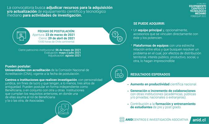 La Vicerrectoría de Investigación, Postgrado e Innovación de la Universidad de Playa Ancha (UPLA) informa que la Agencia Nacional de Investigación y Desarrollo (ANID) abrió el período de postulaciones al X Concurso de Proyectos de Equipamiento Mediano (Fondequip).