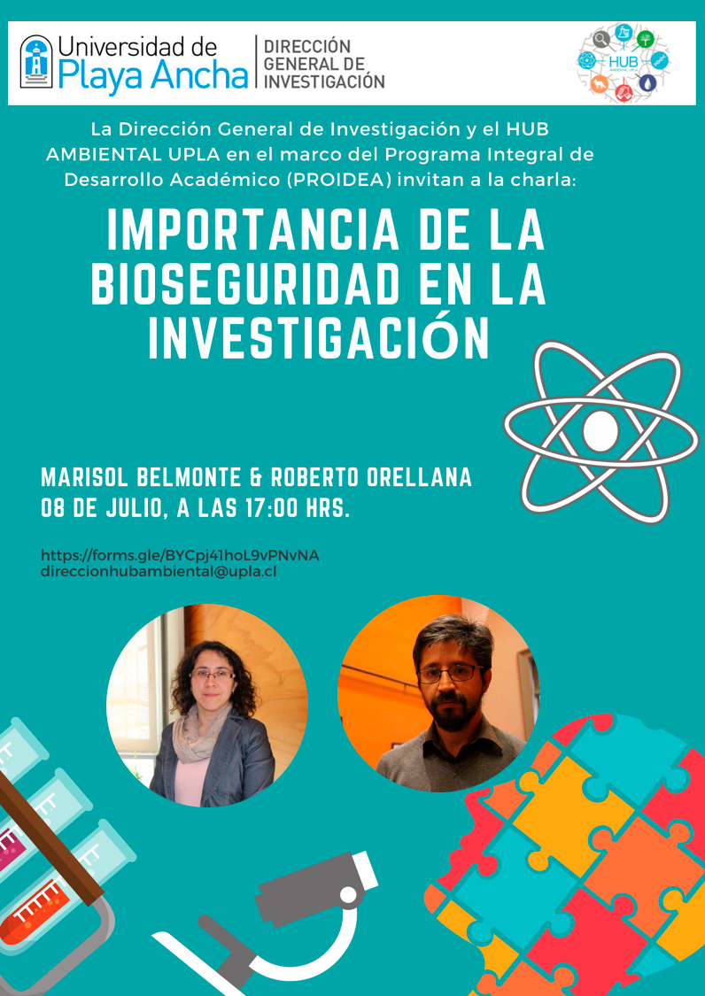 La Dirección General de Investigación de la Universidad de Playa Ancha y el Hub Ambiental UPLA, invitan a la comunidad universitaria a participar de la charla: «Importancia de la bioseguridad en la investigación», en la que expondrá la académica Marisol Belmonte y el investigador Roberto Orellana.