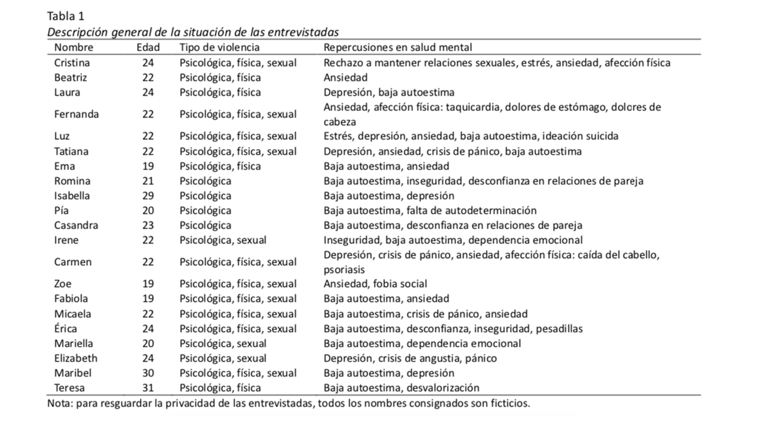 Para la realización de este estudio, se convocó durante el segundo semestre de 2019 a estudiantes universitarias de instituciones de educación superior como, por ejemplo, la Universidad de Playa Ancha (Valparaíso), Universidad del Bío-Bío (Concepción) y Universidad de la Frontera (Temuco), todas integrantes del Consorcio de Universidades Estatales de Chile (CUECH). La convocatoria reunió un grupo de 21 mujeres entre los 19 y 31 años a quienes realizaron entrevistas semiestructuradas que abordaron diversos tópicos, tales como: relaciones de pareja, tipos de violencia de género autoreportada, repercusiones de dicha violencia en la salud mental, y redes formales e informales de apoyo para denunciar (o no) la violencia vivida.