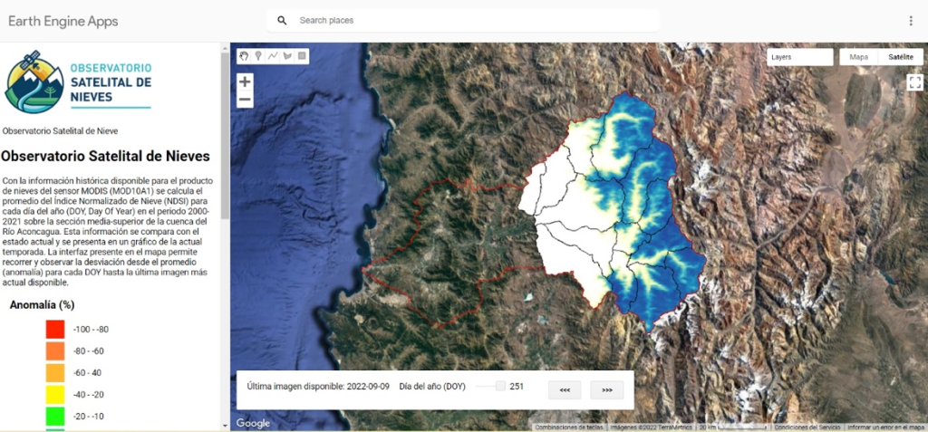 Cuando la nieve estacional y los glaciares aportan agua a más de dos tercios de la población en Chile, el Observatorio Satelital de Nieves ha atendido, durante dos años, la urgencia de comprender el comportamiento nival del río Aconcagua generando información corregida mediante bases de datos y visualizadores satelitales que despliegan datos históricos, mensuales y diarios a través de Google Earth Engine.