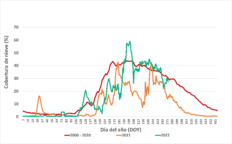No obstante, en comparación con años anteriores, el mes de septiembre retomó los valores históricos alcanzando un 34% de cobertura de nieve cuando, durante el 2021, el promedio fue de un 26%.