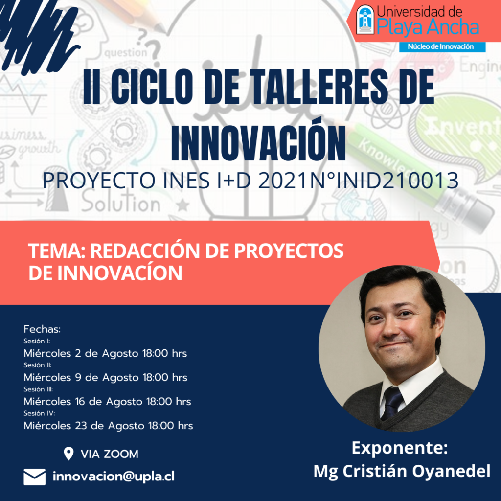 Este próximo miércoles 2 de agosto a las 18:00 horas comienza el II Ciclo de Talleres del Núcleo de Innovación y el proyecto InES I+D 2021 que estará enfocado en la redacción de proyectos de innovación a través de la guía de Cristián Oyanedel, coordinador de la Unidad de Transferencia Tecnológica y Licenciamiento de la Universidad de Valparaíso (UV).