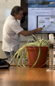 A eso de las diez de la mañana, el Dr. Campos revisitó teóricamente las fuentes, tipos y concentraciones de contaminantes en el agua, con un énfasis en los desafíos que acarrea la explotación agroganadera, así como los componentes de un sistema de tratamiento de aguas a través de lodos activos.