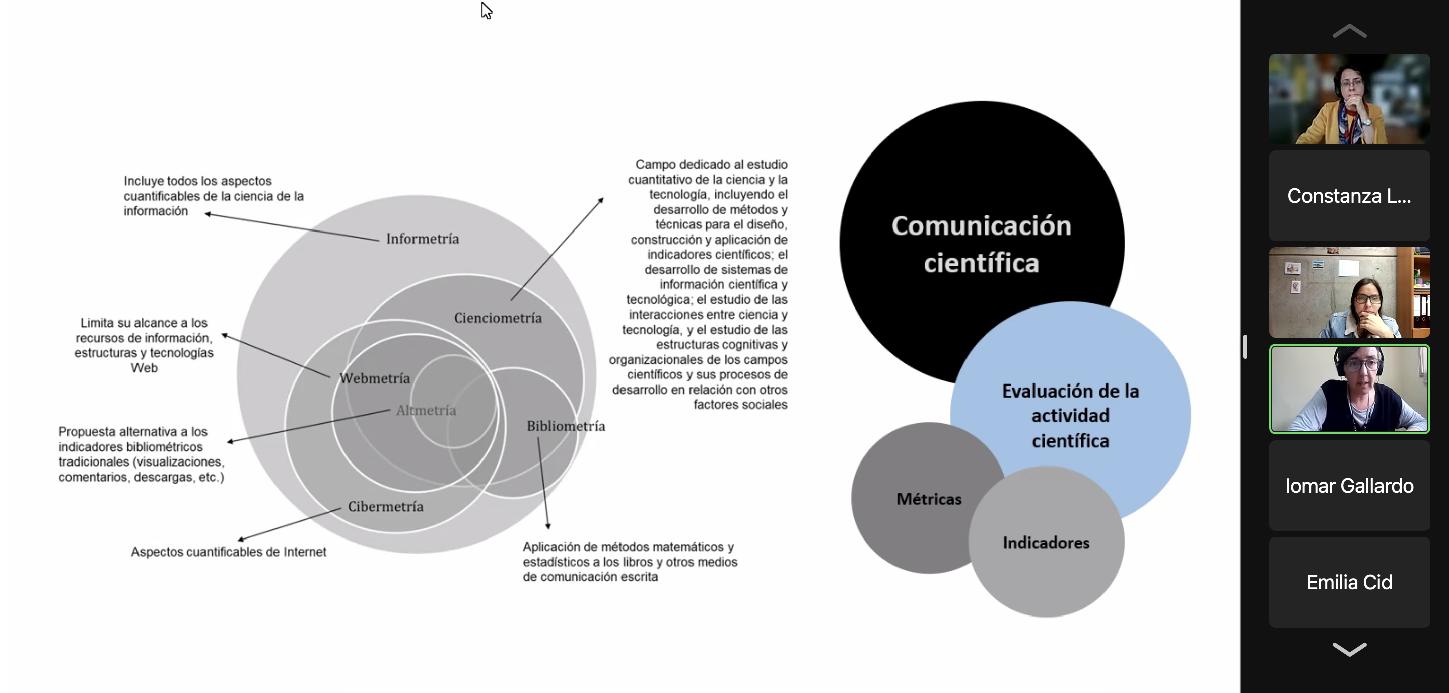 Entendida como el campo dedicado al estudio cuantitativo y cualitativo de la ciencia y la tecnología, incluyendo el desarrollo de métodos y técnicas para el diseño, construcción y aplicación de indicadores científicos, de sistemas de información científica y tecnológica, así como el estudio de las interacciones entre ciencia y tecnología, la cienciometría estuvo al centro de la conversación.