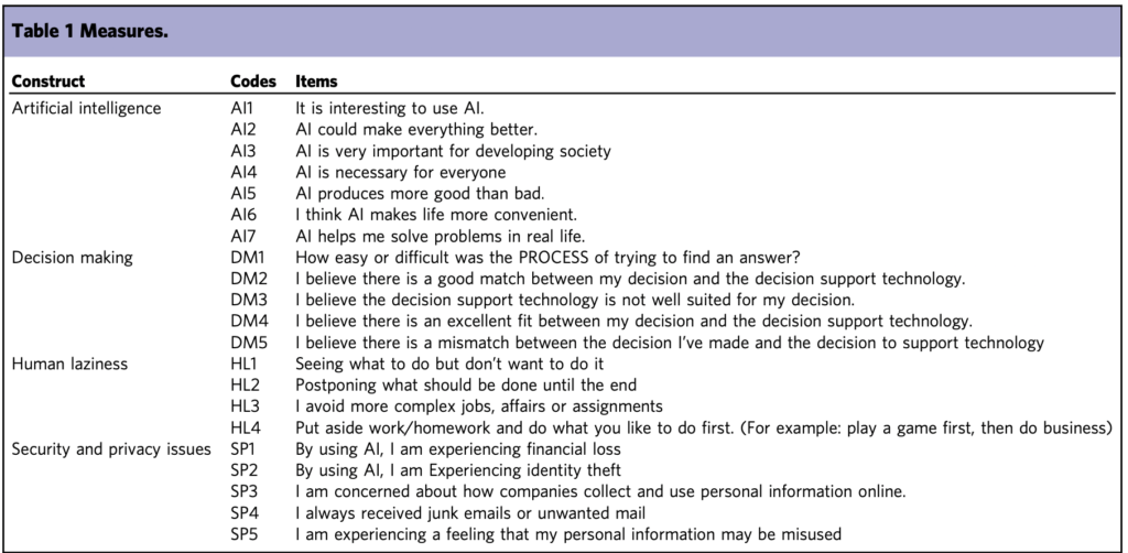 Dividido en dos, el cuestionario contó con una primera parte de levantamiento de información demográfica – como género, edad, país y nivel educacional – y una segunda parte con una escala de valoración y estimación tipo Likert con cuatro constructos – Inteligencia Artificial, toma de decisiones, pereza humana y problemas de seguridad y privacidad – compuestos por 21 ítems.