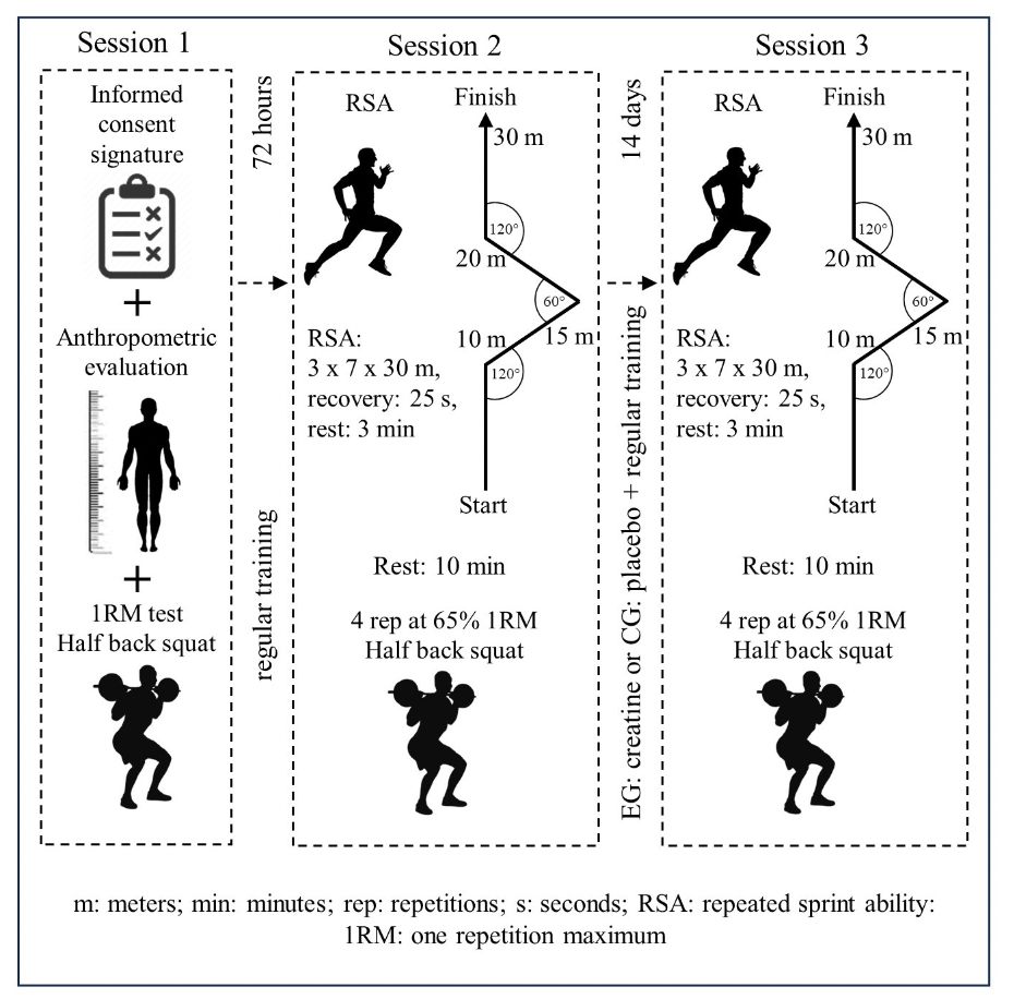 Divididos en dos grupos, experimental (0.3g•kg de creatina) y control (0.3g•kg de maltodextrina), se aplicó una prueba de repetición máxima (1RM), un protocolo de capacidad de sprint repetidos (RSA) para establecer velocidades y tiempos, y un test de sentadilla media posterior (HBS) para conocer las velocidades y potencia generada en las cuatro sentadillas. Durante dos semanas, los futbolistas continuaron con su entrenamiento regular y el consumo de creatina y placebo durante dos semanas.
