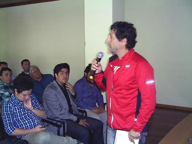 El estratega se hizo presente en la casa de estudios playanchina junto a sus colaboradores Osvaldo Alegría (preparador físico) y Leonardo Zamora (ayudante técnico y preparador de arqueros) -quienes le acompañaron durante todo su periodo como entrenador del seleccionado nacional Sub-20- invitado por el Seminario de Especialización Periodística Deportes I, que imparte el profesor Eduardo Poblete Araya.