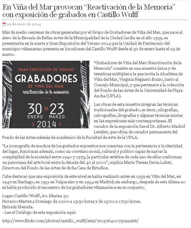 En Viña del Mar provocan “Reactivación de la Memoria” con exposición de grabados en Castillo Wulff Fuente: UCV Radio, publicado el 29 de enero de 2014. Comparte tweet