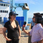La directora del DMA, Eva Soto Acevedo; junto a la secretaria Jazmín Silva Robles, conocieron el barco Ocearch tras su recalada en el Puerto de Valparaíso en el marco del cierre de la 1ª Expedición en Chile, asociada a la presencia de estos escualos.