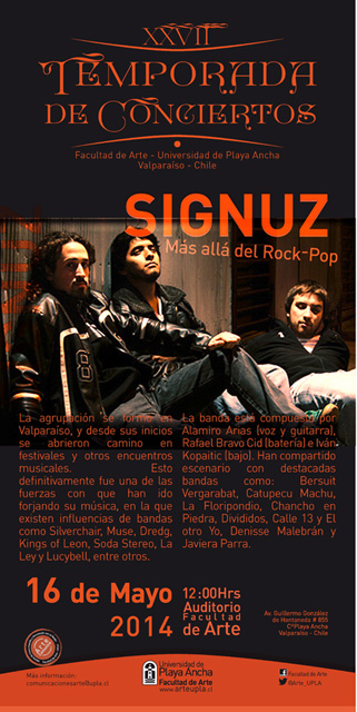 Con la participación del grupo porteño “Signuz” (Más allá del Rock-Pop) continúa este viernes la XXVII Temporada de Conciertos que organiza la Facultad de Arte de la Universidad de Playa Ancha.