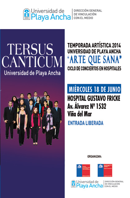 Continuando con el ciclo de conciertos correspondiente al programa “Arte que Sana” se presentará este miércoles 18 de junio, a las 11.00 horas, en el hospital Gustavo Fricke de Viña del Mar el conjunto Tersus Canticum, dirigido por Marcelo Ibáñez Salgado.