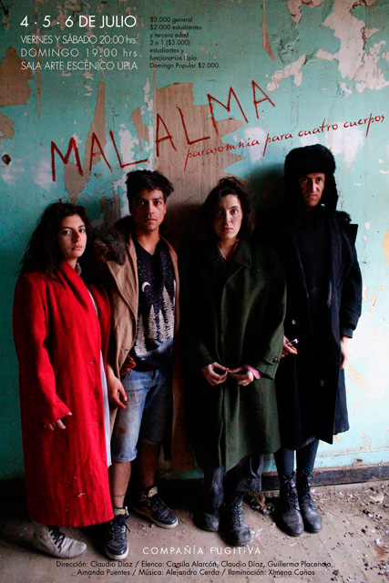 Malalma_salauplaLa danza teatro llega a la Sala UPLA este fin de semana con “Malalma: Parasomnia para cuatro cuerpos”, a cargo de la Compañía Fugitiva compuesta por egresados de la carrera de Teatro de nuestra Casa de Estudios.