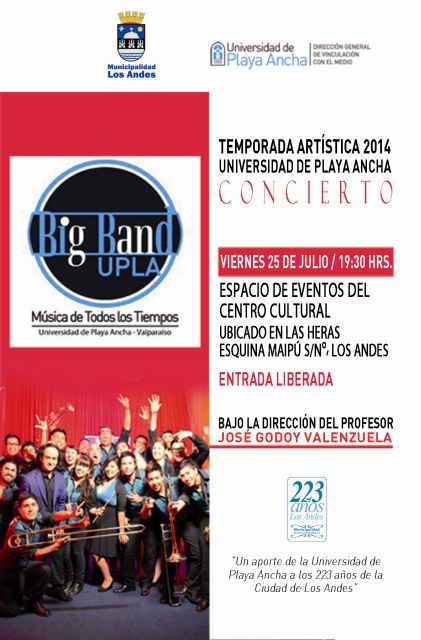 Como parte de las actividades culturales programadas por el municipio de Los Andes para celebrar su aniversario número 223, la Big Band de la Universidad de Playa Ancha, a cargo del profesor José Godoy Valenzuela, preparó un especial repertorio con el que esperan cautivar a la comunidad este viernes 25 de julio, a las 19:30 horas, en el Espacio de Eventos del Centro cultural ubicado en Las Heras esquina Maipú S/Nº, Los Andes.