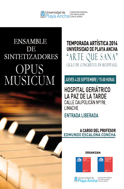 El Ensamble de Sintetizadores “Opus Musicum”, compuesto por estudiantes de la carrera de Pedagogía en Educación Musical de la Facultad de Arte de la Universidad de Playa Ancha, dirigido por el profesor Edmundo Escalona Concha, se presentará de manera gratuita el jueves 4 de septiembre, a las 15.00 horas, en el Hospital Geriátrico “La Paz de la Tarde”, ubicado en calle Caupolicán Nº198, Limache.