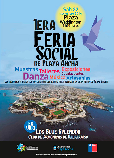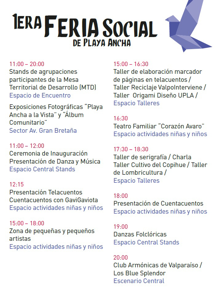 La 1era. Feria Social de Playa Ancha tendrá espacios de actividades para niños y niñas, talleres de reciclaje, origami, serigrafía, lombricultura, charla sobre el cultivo del copihue, cuentacuentos, danzas folclóricas, música, telacuentos, teatro, exposiciones fotográficas, y la presencia en vivo del Club de Armónicas de Valparaíso y los playanchinos de Los Blue Splendor.