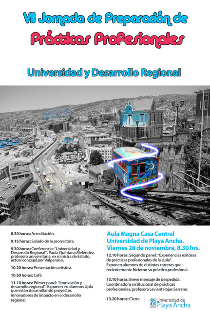 “Universidad y Desarrollo Regional” será el tema central de la VII Jornada de Prácticas Profesionales, que se realizará este viernes 28, a partir de las 8.30 horas, en el Aula Magna de la Universidad de Playa Ancha.