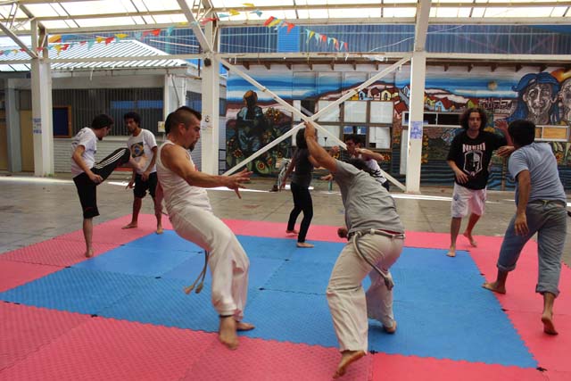 La actividad se realiza todos los lunes y viernes en el Patio Techado y es dirigida por el profesor Cristián Gutiérrez, quien entrega los fundamentos básicos de la capoeira.