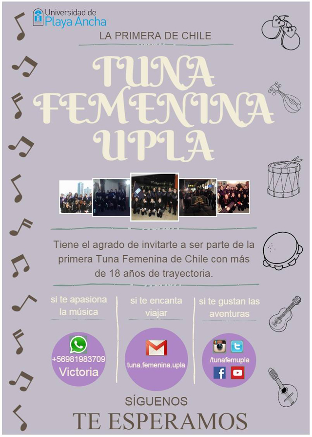 tuna_femenina_upla_aficheSu directora musical, Victoria Gamboa, agregó que la principal característica que buscan en las postulantes es que tengan entusiasmo, muchas ganas de aprender, pasarlo bien, viajar, que les guste la música (aunque no es requisito interpretar algún instrumento o cantar), pero por sobre todo que “quieran aprender y vivir la universidad de una forma diferente, porque esta es la tradición universitaria más antigua del mundo. Acá se van a sentir acogidas, se van a encontrar con buenas personas, un grupo bien conformado, con calidad musical donde prima la fraternidad y hermandad”.