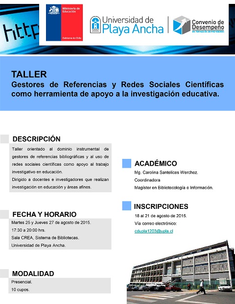 Diez son los cupos para docentes e investigadores interesados en el dominio instrumental de los gestores de referencias bibliográficas y uso de redes sociales científicas como apoyo al trabajo investigativo en educación.