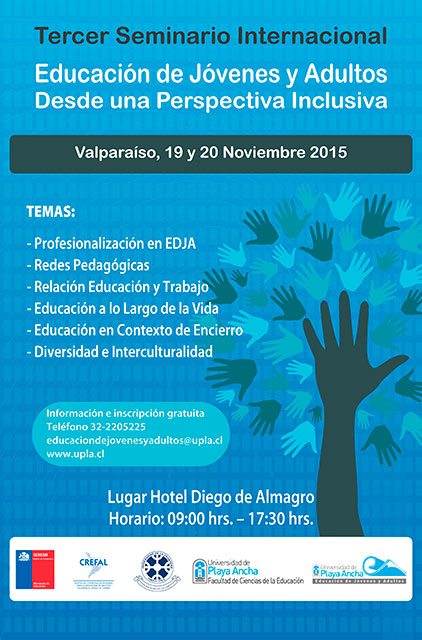 El Tercer Seminario Internacional “Educación de Jóvenes y Adultos desde una Perspectiva Inclusiva” es organizado por el Programa Disciplinario de Educación de Jóvenes y Adultos y el Magíster de Educación de Adultos y Procesos Formativos de la Facultad de Ciencias de la Educación de la Universidad de Playa Ancha en conjunto con el Centro de Cooperación Regional para la Educación de Adultos en América Latina y el Caribe CREFAL, el Ministerio de Educación y la Línea de Educación de Adultos del Departamento de Educación de la Universidad de La Frontera.