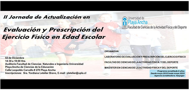Compartir experiencias investigativas y de trabajo académico y científico es uno de los principales objetivos que tiene la II Jornada de Actualización en Evaluación y Prescripción del Ejercicio Físico en Edad Escolar que se realizará el 2 de diciembre, a las 15.00 horas, en el auditorio del edificio de Ciencias e Ingeniería de la Universidad de Playa Ancha.