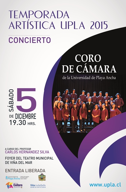 El Coro de Cámara de la Universidad de Playa Ancha, dirigido por el profesor Carlos Hernández Silva, bajará el telón de la Temporada Artística 2015 iniciada en mayo por esta casa de estudios, que contempló la presentación de sus distintas agrupaciones ligadas al arte, la música y la cultura en espacios públicos.