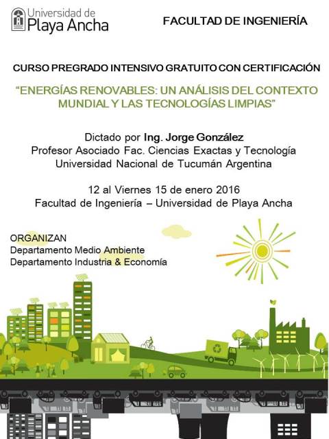 afiche curso energías renovablesLos departamentos de Medio Ambiente e Industria y Economía de la Facultad de Ingeniería de la Universidad de Playa Ancha, invitan a participar en el curso gratuito de pregrado intensivo, «Energías Renovables: Un análisis del contexto mundial y las tecnologías limpias», que impartirá el académico de la Universidad Nacional de Tucumán, Argentina, Ing. Jorge González, desde el 12 al 15 de enero de 2016.