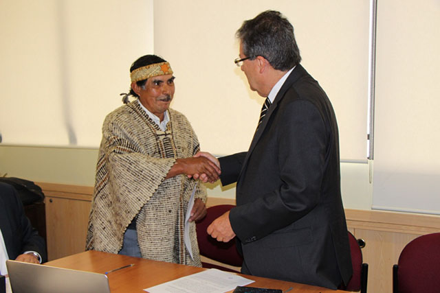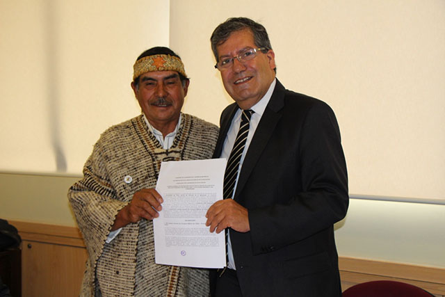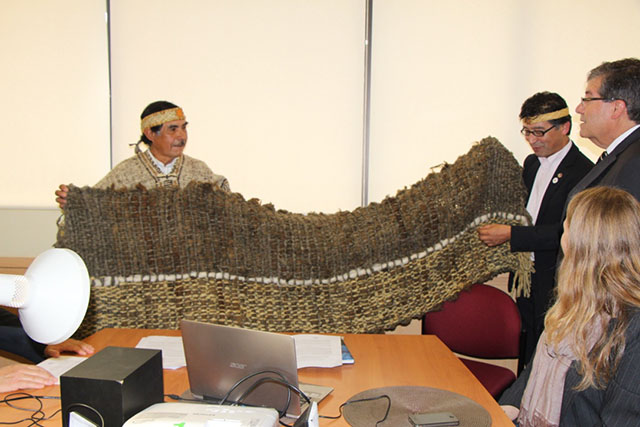 Jorge Guenuman Nain destacó el valor de esta iniciativa al precisar que: “estoy muy orgulloso y contento de esta firma, porque trabajar en conjunto con esta universidad es muy importante para nuestro pueblo. Vivimos en sectores rurales muy alejados, por lo tanto, celebramos este día”, dijo Guenuman, quien entregó al rector como recuerdo, un manto tejido en lana natural.