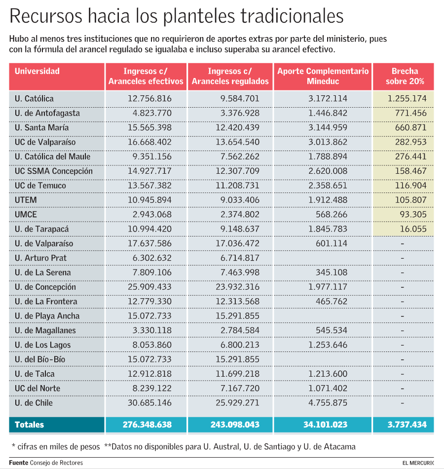 El rector de este último plantel, Claudio Elórtegui, señala que su brecha de $282 millones es un poco inferior a la estimada. «Pero sin duda es un problema. Nuestra universidad es más pequeña que otras, entonces un monto así nos afecta». Por eso le preocupa la ampliación de la gratuidad, porque a medida que se incorporen más estudiantes, «estos montos no cubiertos, que generan una caída en los ingresos institucionales, se irían incrementando».