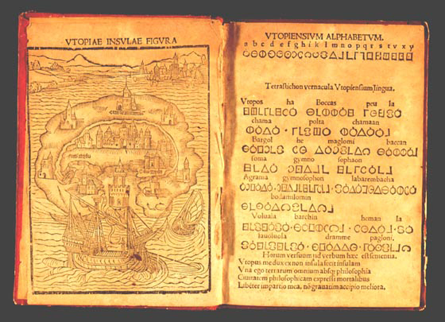 La “Utopía” de Moro está dividida en dos partes. La primera, fue escrita en 1516, mientras que la segunda, el año anterior. Rafael Hitlodeo, según la narración dialogada, había sido compañero del navegante Américo Vespucio, y la mayor parte de la obra trata de la descripción de Hitlodeo de una distante república: Utopía. La palabra ha pasado a designar con el tiempo un no lugar, un espacio imaginario e ideal, que es también una Ucronía, es decir, que no está en ningún tiempo. El humanista Tomás Moro calificó esta obra como festiva. Sin duda, que la “Utopía” tiene rasgos escriturarios que revelan la personalidad de Moro a que hemos aludido. La obra como un divertimento y con un carácter lúdico que salta desde las primeras páginas. Sin embargo, esta dimensión lúdica es aparente, ya que tras lo festivo está una obra que tiene un contenido complejo y denso. Se trata de un texto de “una honda y acerba crítica social y política. Es indudable esta intención crítica, pues, como filigrana y trasfondo, se punta siempre a la Inglaterra y la Europa coetáneas”.