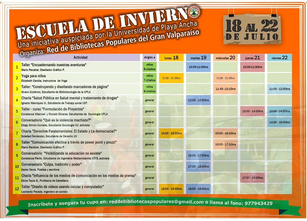 En el siguiente archivo se detallan las salas en que se realizarán las clases de estos 12 talleres.