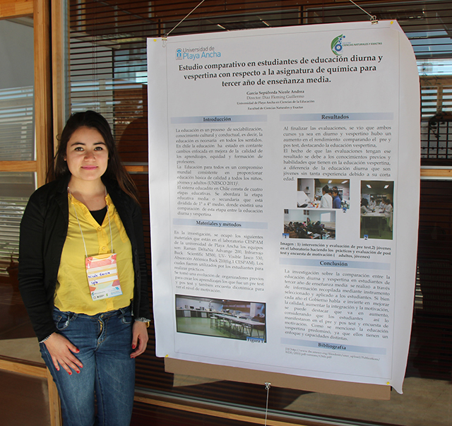 Nicole García Sepúlveda, estudiante: “Estudio comparativo en estudiantes de educación diurna y vespertina con respecto a la asignatura de química”. “Este trabajo se refiere al desempeño de los estudiantes que tienen jornada diurna respecto de los adultos que estudian en jornada vespertina dentro del laboratorio de espectroscopia y así tener una comparación de estos resultados”.