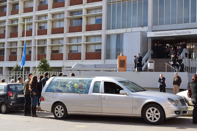 funerales_felixmoralespettorino_upla_06Él hizo y creó una línea de desarrollo investigativo en la Universidad de Playa Ancha, una línea muy fuerte en la que participan quienes fueron sus discípulos Oscar Quiroz Mejías, Daniel Lagos Altamirano, Dora Mayorga, Patricia Arancibia y tantos otros. Su actitud constituye y seguirá constituyendo un orgullo para la Universidad de Playa Ancha. Es y será para siempre uno de los grandes de esta casa de estudios, el primer Honoris Causa acordado en el pleno del Consejo Académico y de la Junta Directiva, otorgado a su impecable trayectoria. Quiero comprometer como rector que esta universidad no olvidará jamás a Félix Morales y haremos todo a nuestro alcance para que sea recordado en los próximos años por esta comunidad”.