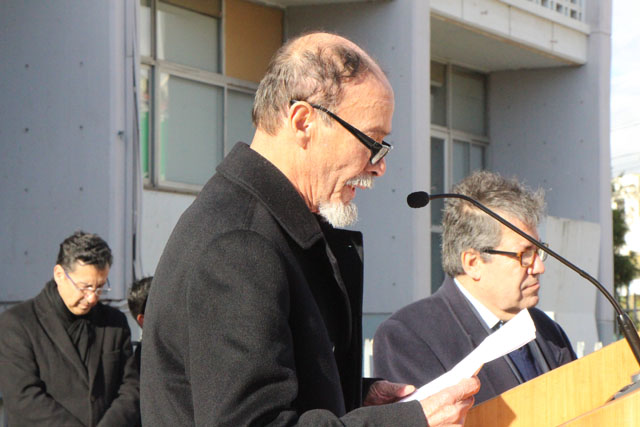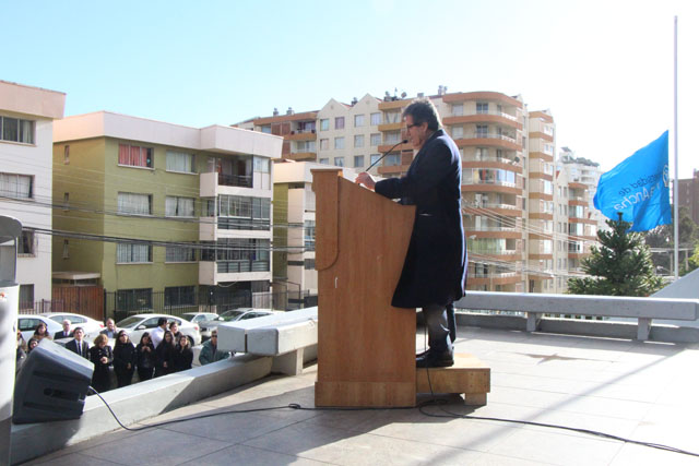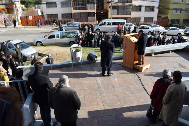Fue así como en el frontis de la Casa Central de la Universidad de Playa Ancha se instaló un improvisado escenario en el cual el rector Patricio Sanhueza Vivanco junto a los académicos de la Facultad de Humanidades, Daniel Lagos Altamirano y Oscar Quiroz Mejías, expresaron su sentir frente al cortejo que se detuvo en la UPLA previo a su partida al cementerio Nº 3.