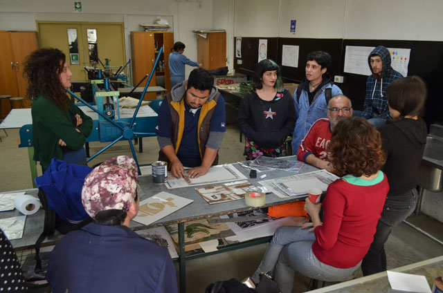 La actividad, enmarcada en la pasantía que el artista mexicano efectuó en la UPLA, consistió en una serie de clases con 20 estudiantes de Licenciatura en Arte y de Pedagogía en Artes Plásticas, donde trabajó la técnica de reproducción de matrices de cartón con texturas, que al ser forradas con aluminio permiten que sus relieves entintados generen formas resaltantes dando origen a texturas diferentes por medio del prensado.