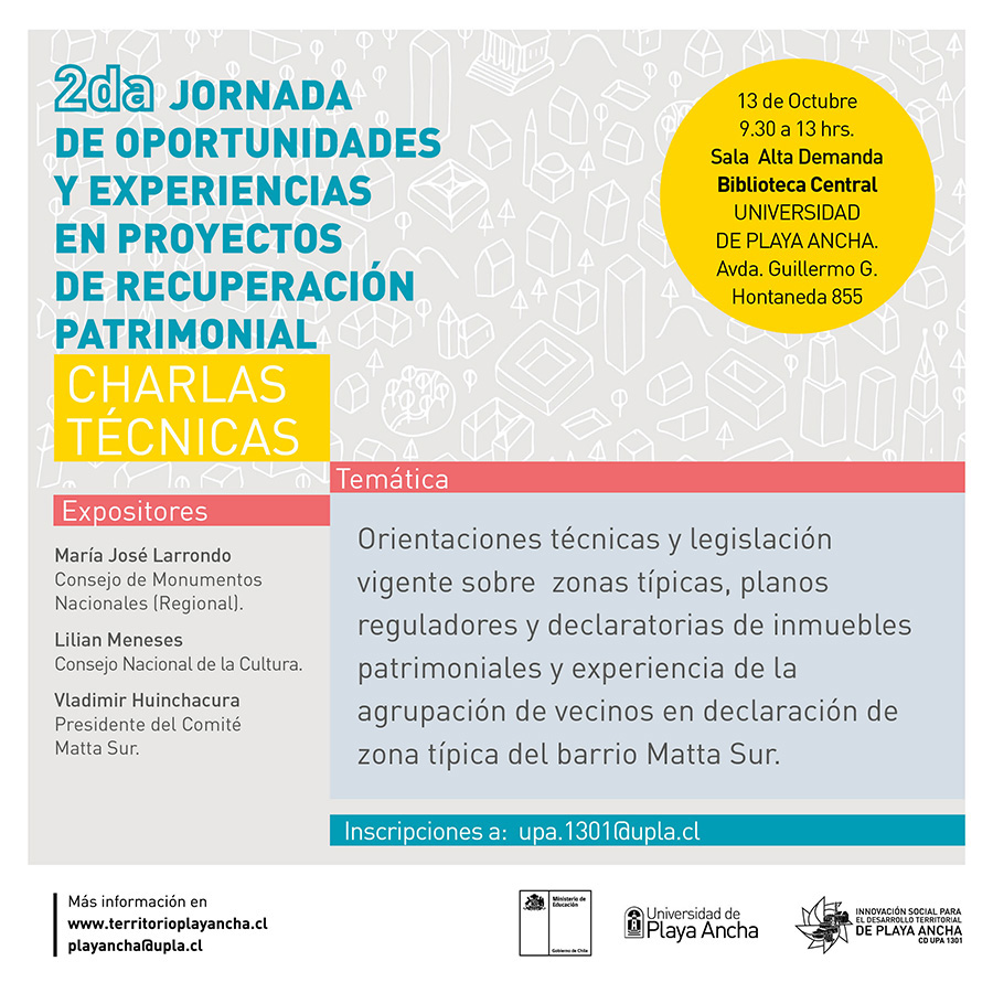 charlas_tecnicas_cdplayanchaLa experiencia del barrio santiaguino Matta Sur, que en 2015 -luego de años de esfuerzo de sus vecinos- fue declarado por el Consejo de Monumentos Nacionales como zona típica, será abordada en la “Segunda Jornada de Oportunidades y Desafíos en Proyectos de Recuperación Patrimonial”, que se realizará el jueves 13 de octubre en la Universidad de Playa Ancha (UPLA).
