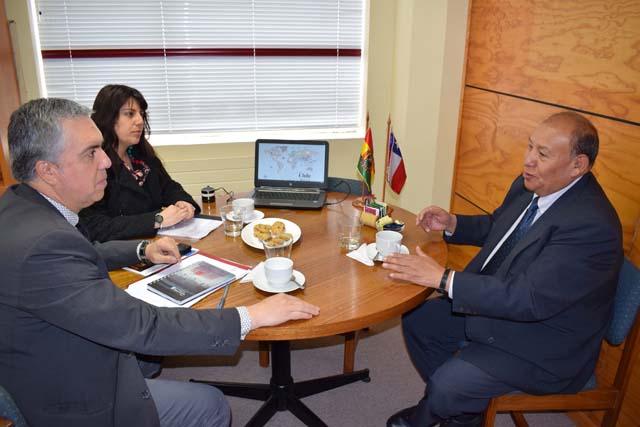 El docente boliviano recibió el saludo de bienvenida de parte del director de Relaciones Internacionales, Dr. José Manuel Olivares, la vicerrectora académica, Cecilia Arriagada, y el decano de la Facultad de Ciencias de la Educación, Dr. Luis Alberto Díaz.