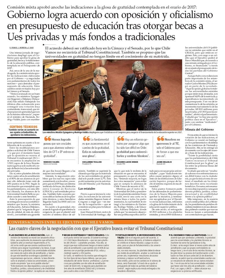 Una intensa jornada de negociaciones desplegó ayer el Gobierno para aprobar la glosa de gratuidad, becas y fortalecimiento de la educación pública, contemplada en el Presupuesto de 2017.